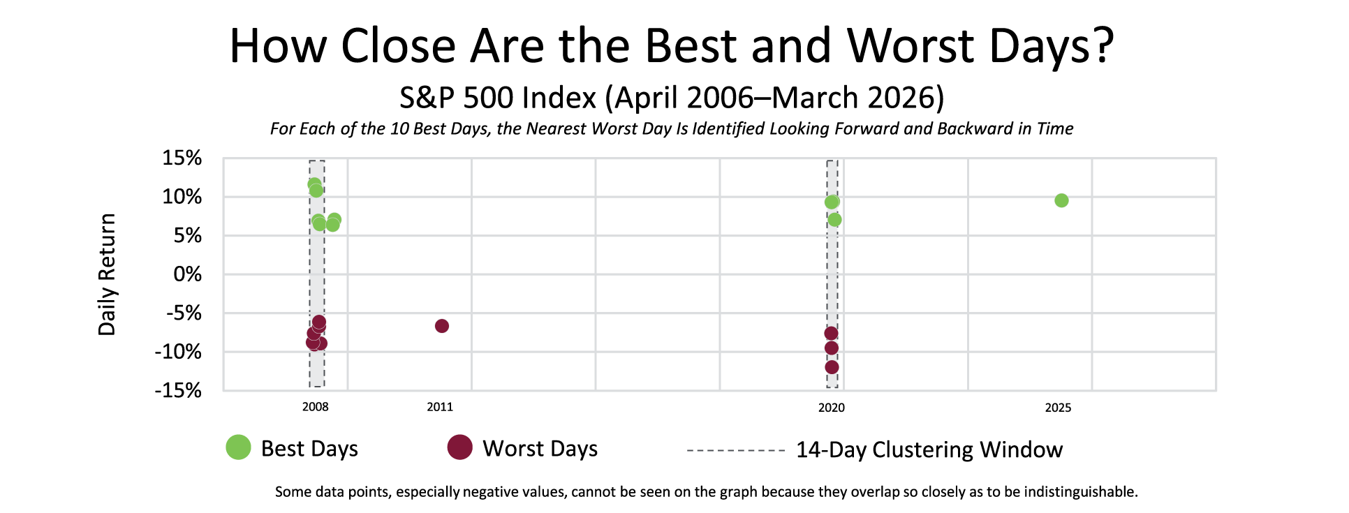 Research supports this intuition. Studies have consistently shown that the majority of the stock market’s long-term returns come from a surprisingly small number of trading days. Missing just a handful of the market’s best days over a 20-year period can cut your total return nearly in half.1 The best days also tend to cluster near the worst ones, with 6 of the market’s 10 best days happening within two weeks of one of the 10 worst days, when looking back at the past two decades.2