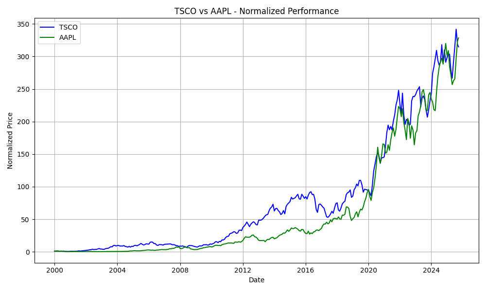 First up: Tractor Supply vs. Apple. In the first chart, the green line represents Apple’s market performance, while the blue line shows Tractor Supply. Surprisingly, over nearly 25 years, their performance has been remarkably similar.